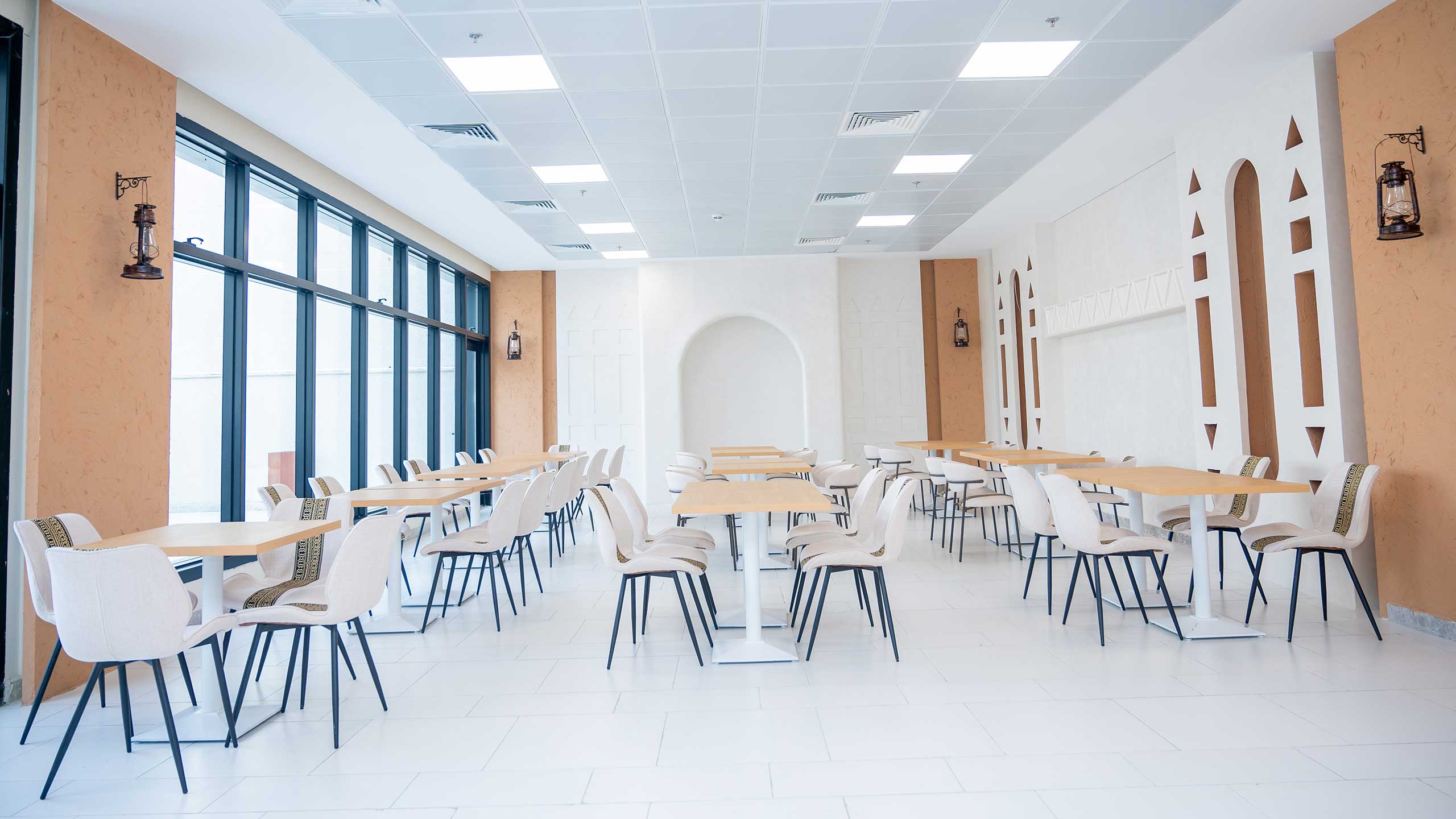Multiple cafeterias provide a comfortable environment for meals and social interaction.
